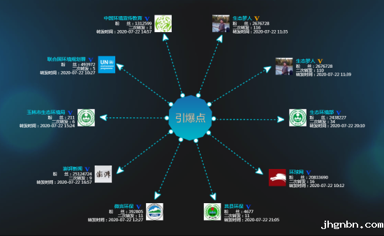 截止7月27日,相关微博阅读量达到221.2万次,转发240次,点赞49次,短视频播放量18.9万次,相关微博话题 #绿色制冷,清凉世界# 阅读量达到421.7万次,讨论597次。吸引了多个政府机构、媒体、名人等微博大V账号转载(图2),包括 @生态环境部、@联合国环境规划署、@环球网、@澎湃新闻、@生态梦人(山东环保基金会秘书长、部宣教中心环境公众参与研究员王必斗)、@巴松狼王(中华环保联合会副主席、生态环境部世界环境日特邀观察员杜少中)等。在经过多级传播后,信息传播效果进一步扩大,形成了多个影响力较强的节点相互呼应的传播局面,进一步扩展了信息传播的广度和深度,取得了良好传播效果。
