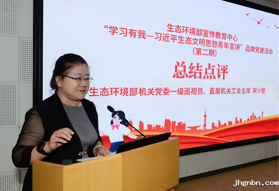 宋小智在总结点评中对本次青年宣讲活动予以充分肯定。她认为,宣教中心举办的品牌党建活动形式活泼、有特色、有创意,展示出了宣教中心青年的蓬勃朝气和工作特点。宣教中心党委专门为青年谋划搭建学习交流平台,充分表明了宣教中心党委对青年工作的高度重视和对青年同志的关心支持。希望宣教中心将活动坚持下去,不断总结提升,把“品牌”擦得更亮,让青年们得到更多成长锻炼。她也勉励宣教中心青年要继续深入学习贯彻党的二十大精神和习近平生态文明思想,深刻领会习近平总书记同团中央新一届领导班子成员集体谈话精神,立足岗位、苦练本领、创先争优,用生态环保铁军的要求锤炼自身能力品格,为全面推进美丽中国建设,加快推进人与自然和谐共生的现代化贡献青年的智慧和力量。
